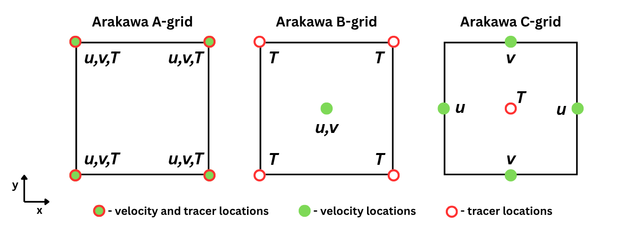Conceptually, transforming from one grid to another is a simple procedure if the original data grid is known; however, it can be confusing to do it in an efficient and correct way. Because of this, the more common transformations from different grids are provided. The figure below presents the Arakawa A, B and C grid layouts in 2D. The idea is to take the necessary data points and between them find the average value, which would represent the center location between those data points. For example, if we have a square and we want to find the value in the center, we would simply average the data points that are at the corners of the square. This principle is further extended for a cube shape, for example.