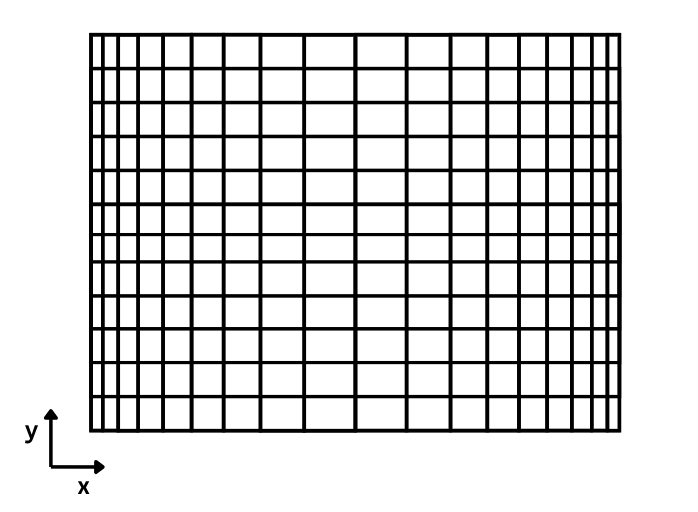 In the double DO-LOOP, we iterate through each element of the 2D arrays of dxv and dyu and define the distance between two consecutive points, where velocity values will reside on the grid. As can be seen, in the east-west direction the grid size is changing in size. A visual representation of the grid that this code sets up in the horizontal direction is presented in the figure below. It's an exaggerated example, but it paints a clear picture.