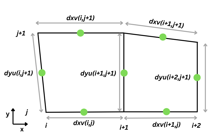 Similarly, as dyu and dxv parameters, the dzt measures the cell depth at the tracer's location. Finally, the cell face's horizontal area dxdy is calculated by simply multiplying the lengths of the cell at velocity points